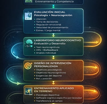 El proceso se apoya en un Laboratorio Neurocognitivo orientado a la evaluación y desarrollo individualizado de funciones clave para el rendimiento, como la atención, la toma de decisiones, la velocidad de procesamiento, la anticipación y la regulación emocional. Utilizamos biofeedback, sensores de variabilidad cardíaca (HRV) y software de entrenamiento cognitivo específico, seleccionado y adaptado según las necesidades reales de cada deportista, con foco en transferencia al campo y no en enfoques de neuromarketing o estímulos genéricos sin impacto deportivo.