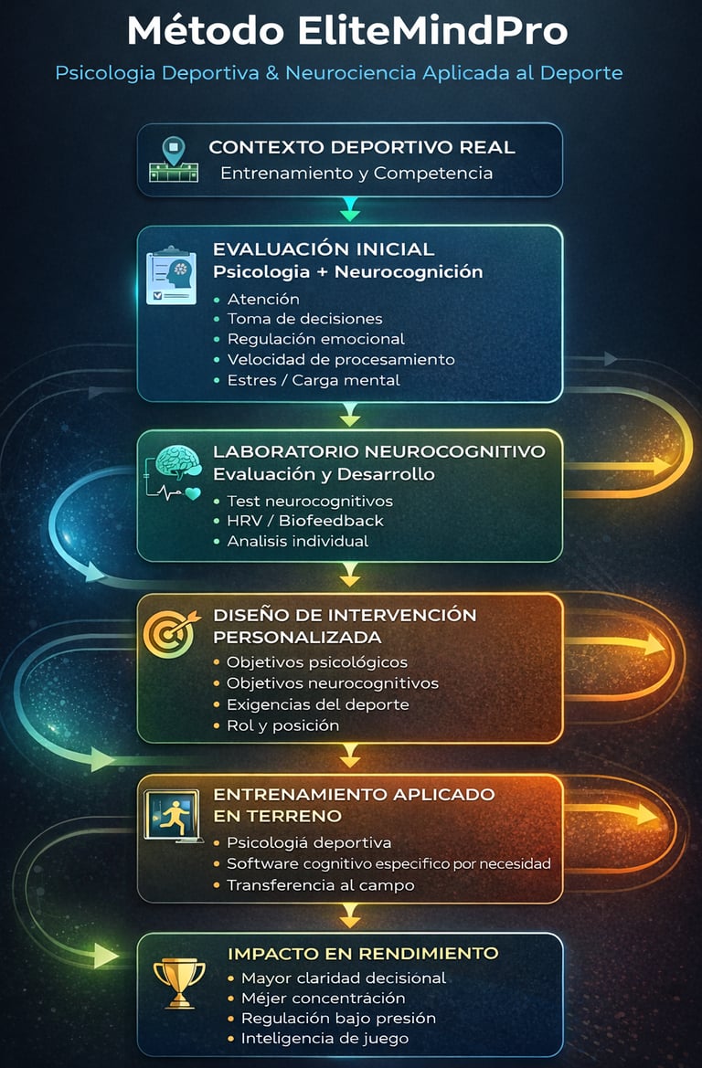 En EliteMindPro desarrollamos un método propio que integra psicología deportiva, neuropsicología aplicada al deporte y tecnología especializada para optimizar el rendimiento deportivo, a través del entrenamiento de los procesos mentales y neurocognitivos que influyen directamente en la performance.
